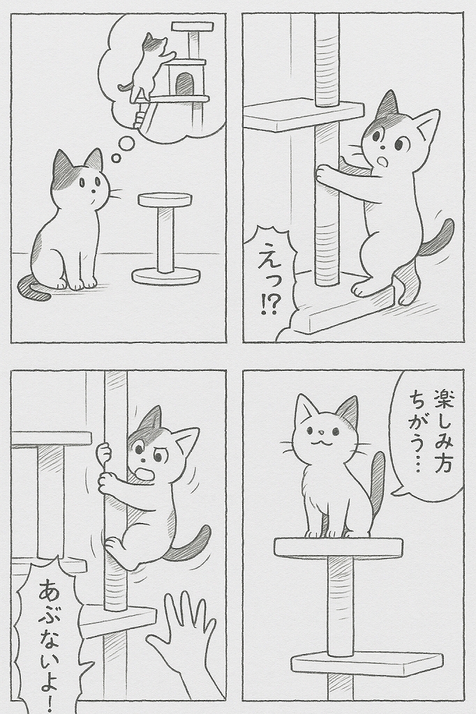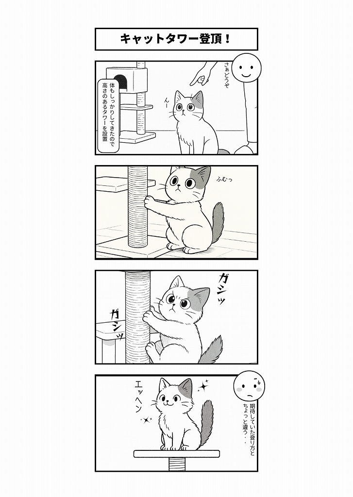 今回は、猫がキャットタワーに挑む姿を描いた4コマ漫画を紹介します。勢いと根性で登頂していく様子は、思わず笑ってしまうかわいらしさです。