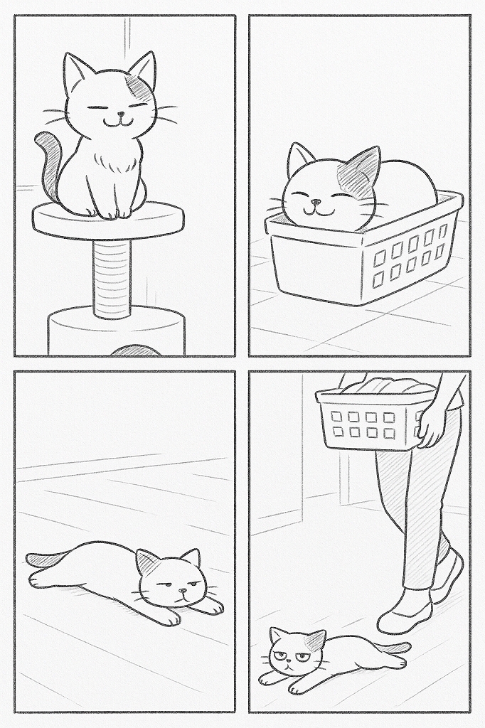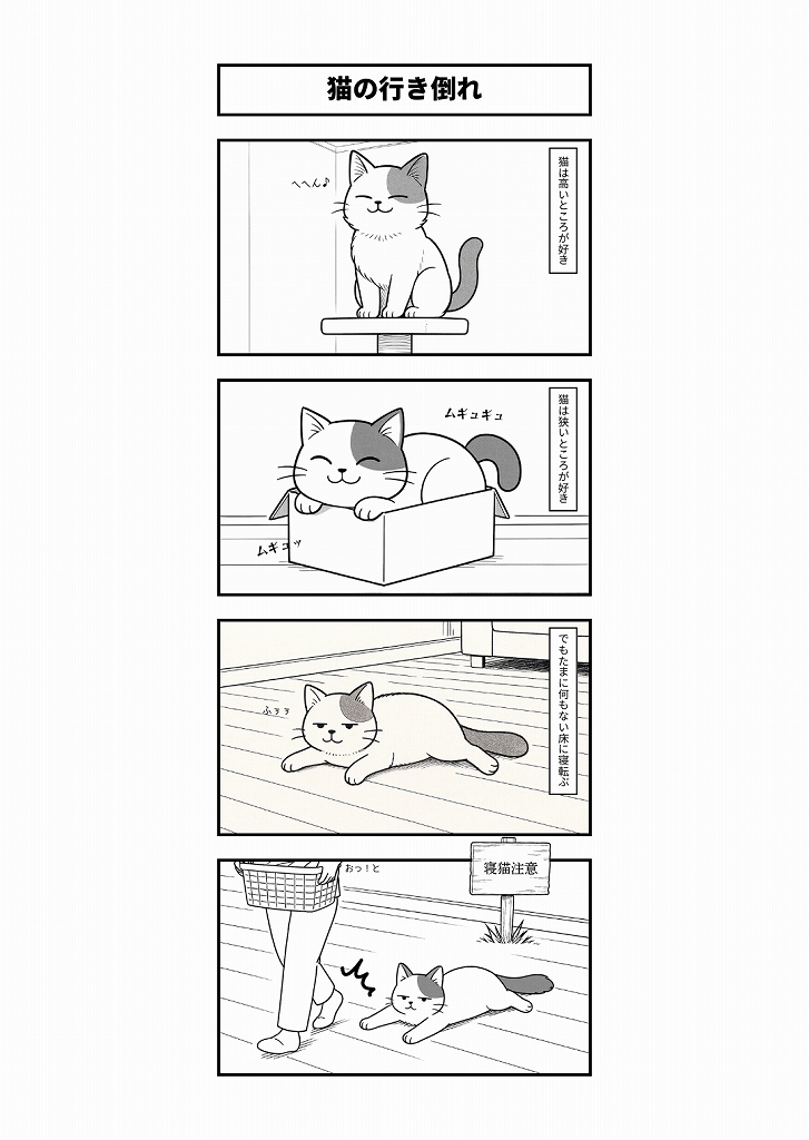 今回はなぜそこに?と思わずにいられない猫の行動をテーマにした4コマ漫画です。猫が安心できるお気に入りの場所で寛ぐ様子から、さらに何もない床に大胆に寝そべる姿まで。その気ままさに思わずクスッとしてしまいます。