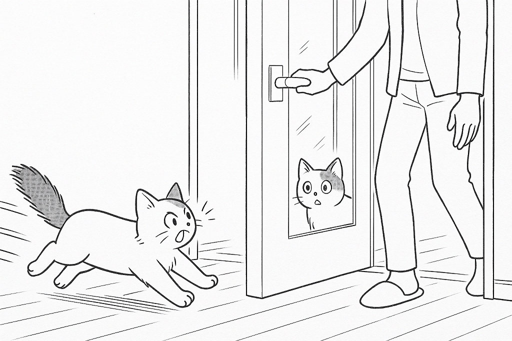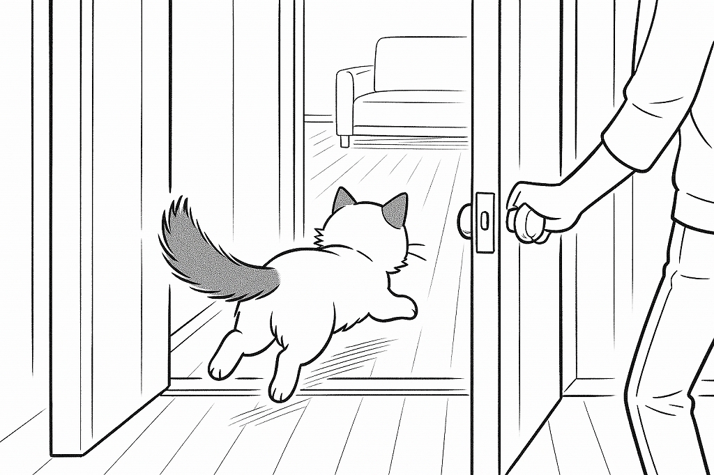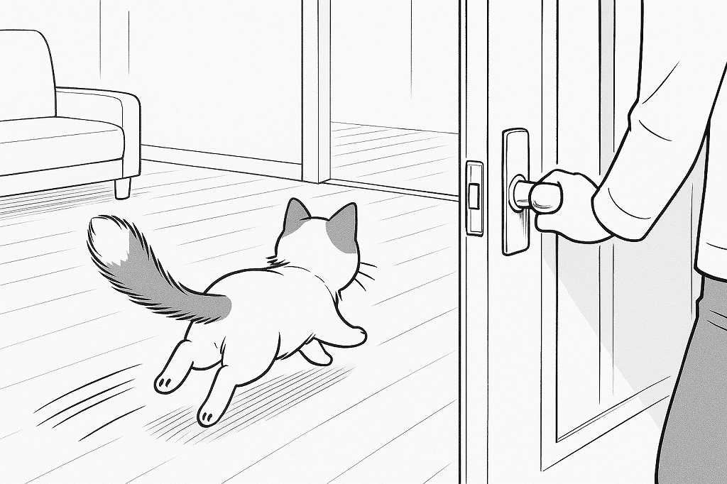 内容:飼い主がドアを開けて戻ろうとする瞬間、猫がダッシュで逃げる。