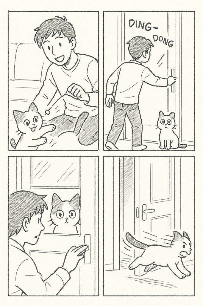内容:インターホンが鳴り、飼い主がドアを開けて外に向かう。猫はリビングに残り、ドアのほうを見ている。