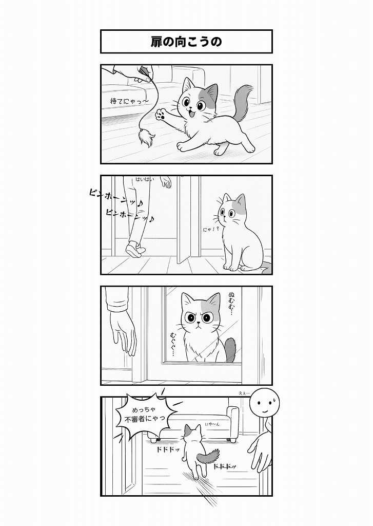 今回のAI4コマ漫画は『扉の向こうの』です。猫がガラス越しに飼い主と初めて対面した日の出来事です。さっきまで仲良くおもちゃで遊んでいたのに…扉を挟んだとたん友好的な態度が一変。そんな日常のワンシーンを4コマ漫画にしてみました。