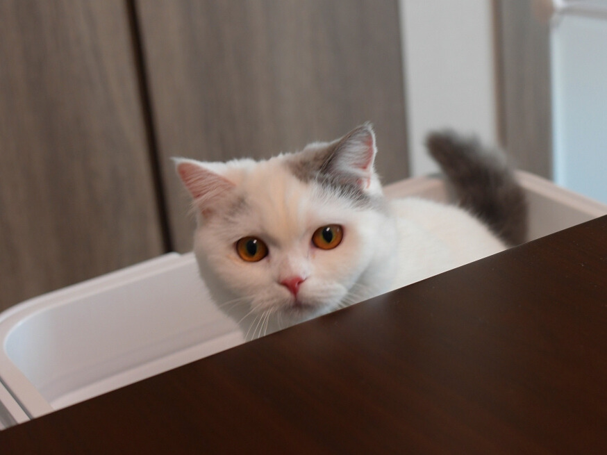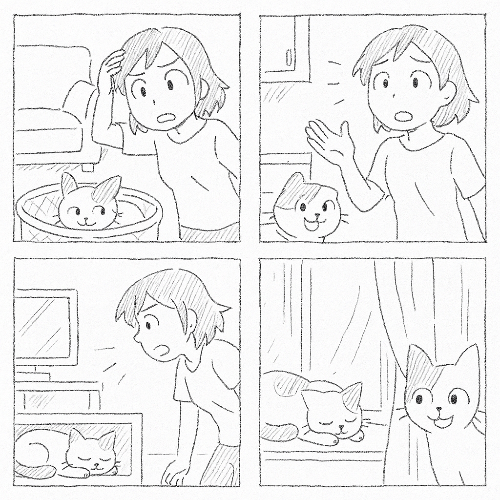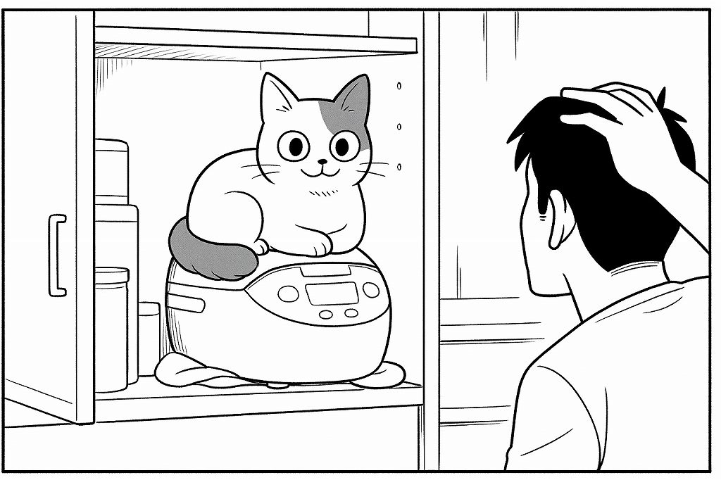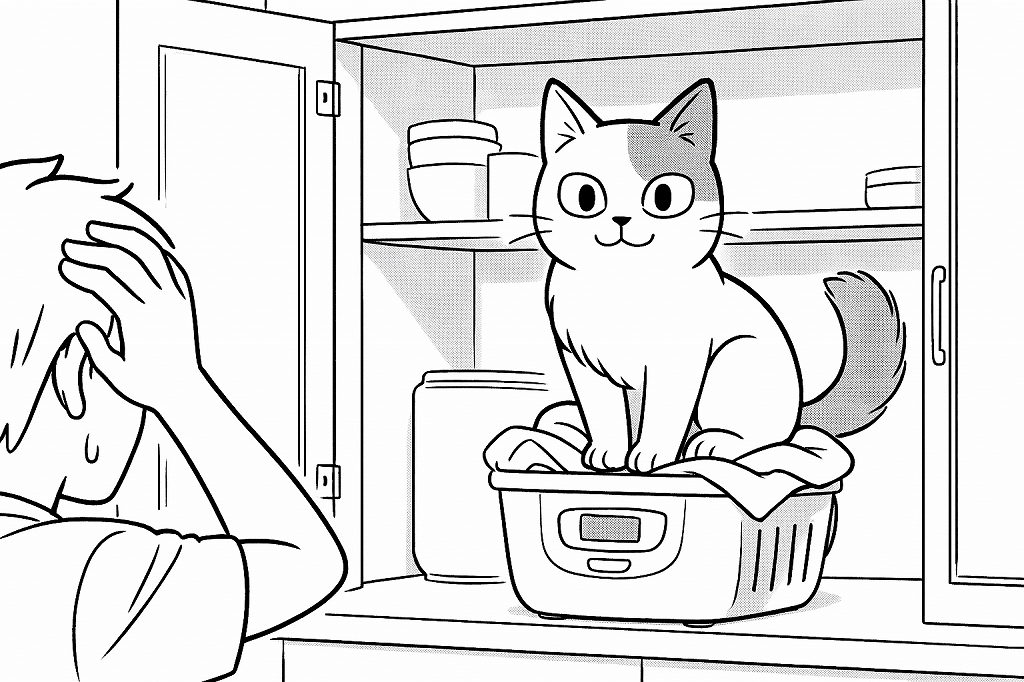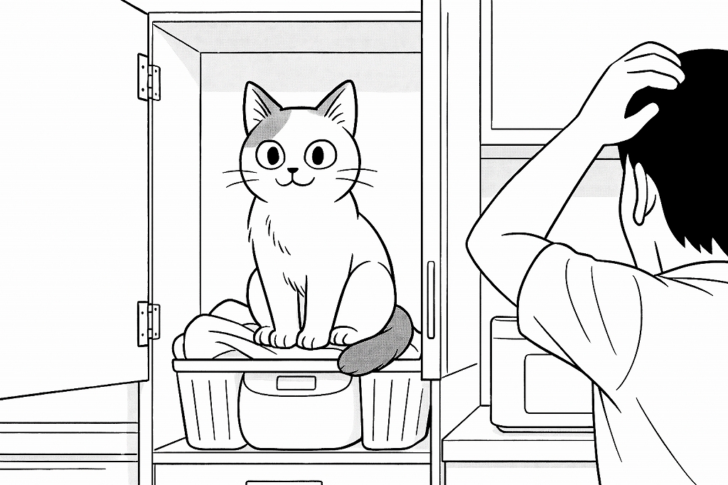 場面:キッチン。猫がまた姿を消している。飼い主が困惑顔であたりを探す。