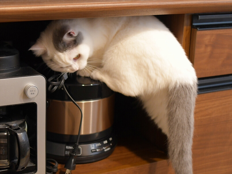 実は食器棚の扉が少し開き、中で猫が炊飯器の上に乗っている。