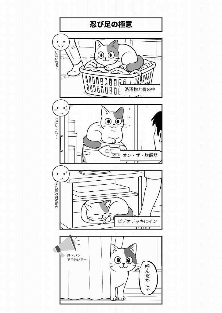 今回は、日常の中でそっと姿を消す「猫の忍び足術」をテーマにした4コマ漫画です。