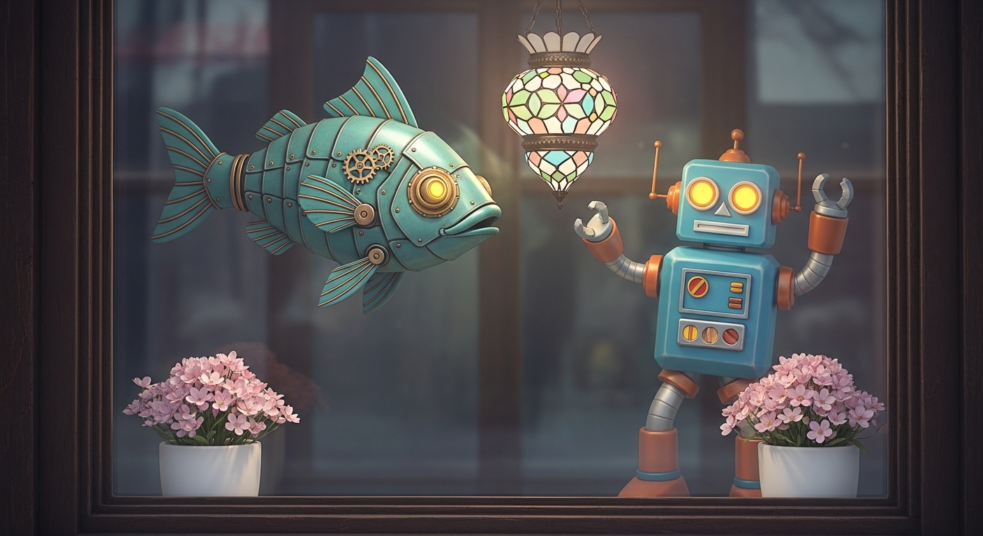 構図:そのカメラが起動してレンズが光る(動作開始の演出)。背景にチラッと猫のしっぽや影が写る。
