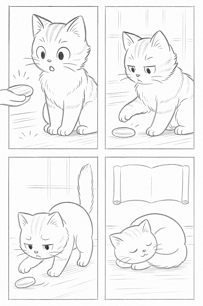 4コマ目不採用 タイトル「丸いしっぽの子猫と巻物」