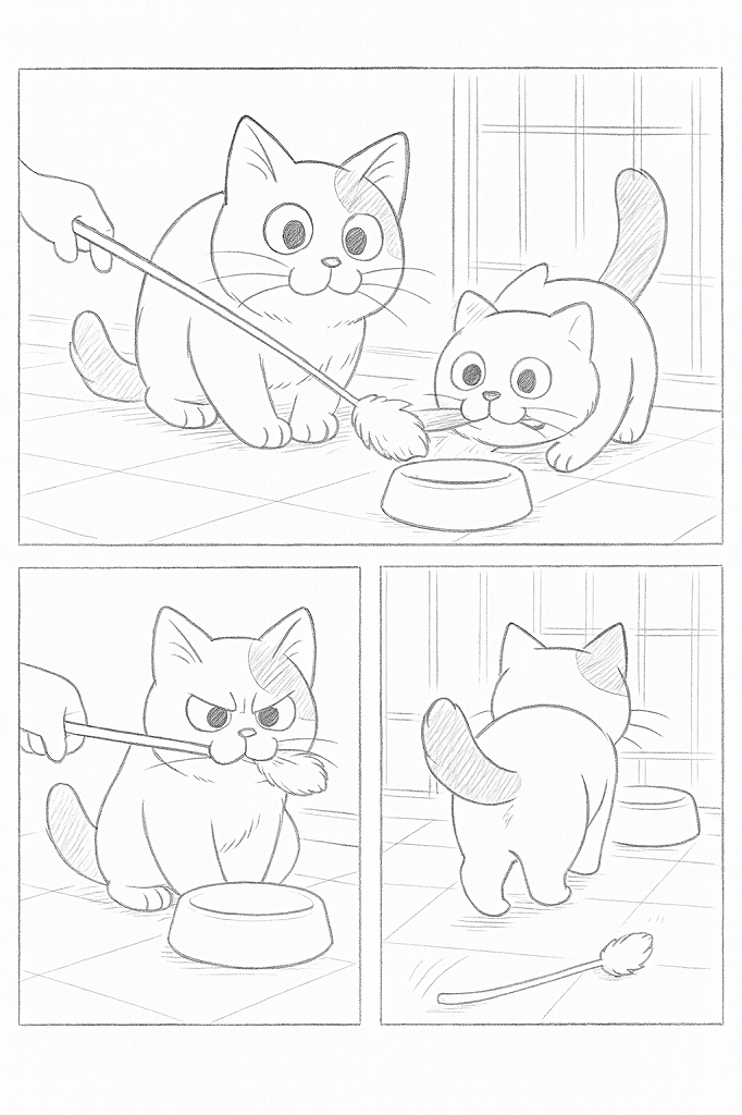 ポイント:小さな攻防の緊張感と、猫の意固地さをコミカルに見せる。